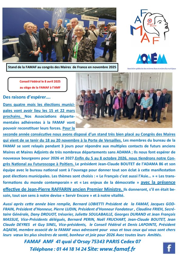 Et pour la FAMAF que pourrions-nous espérer ? Dans quatre mois les élections municipales vont avoir lieu les 15 et 22 mars prochains. C’est un grand moment démocratique et la commune est l’échelon administratif qui reçoit 65% d’assentiment de nos concitoyens notamment grâce aux Maires. Alors qu’on les disait fatigués, ils sont 60% prêts à rempiler pour un nouveau mandat de 6 ans. Avec 40% d’anciens Maires et Maires Adjoints, nos Associations départementales adhérentes à la FAMAF vont pouvoir reconstituer leurs forces. Le bureau national de la FAMAF a préparé un argumentaire pour permettre de faire grossir les rangs de nos 50 ADAMA.